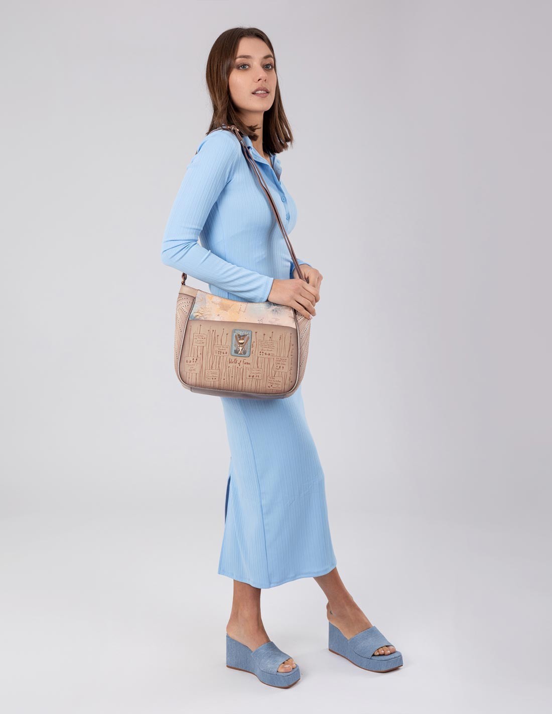 - Estil únic: Amb un bonic color beige i tocs en rosa, cru i daurat, aquesta bandolera presenta un disseny que no passarà desapercebut. A més, compta amb un estampat frontal d'Anekke a l'avinguda de la fama de Hollywood, creant un look incomparable.