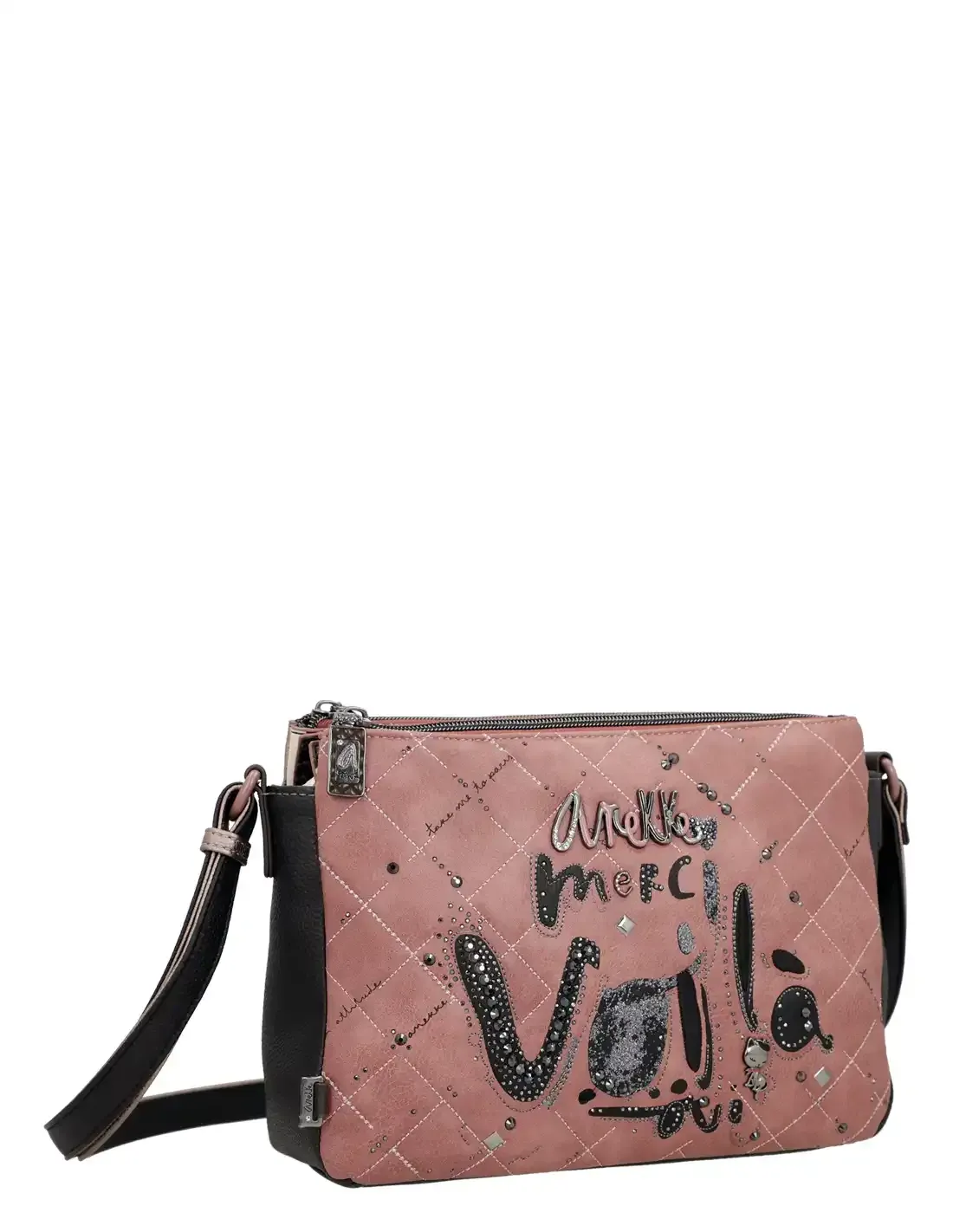 - Disseny parisenc amb caràcter propi. Frontal rosat amb la frase “Merci Voilá”, textures úniques, part posterior metal·litzada i laterals en negre, amb pegat d’Anekke al costat de la Torre Eiffel a la butxaca del darrere.