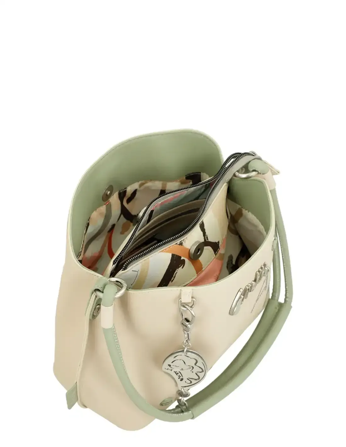 - Color beige amb detalls verds fàcils de combinar. Versatilitat perquè combinis la teva bossa amb qualsevol look i vagis sempre perfecta.