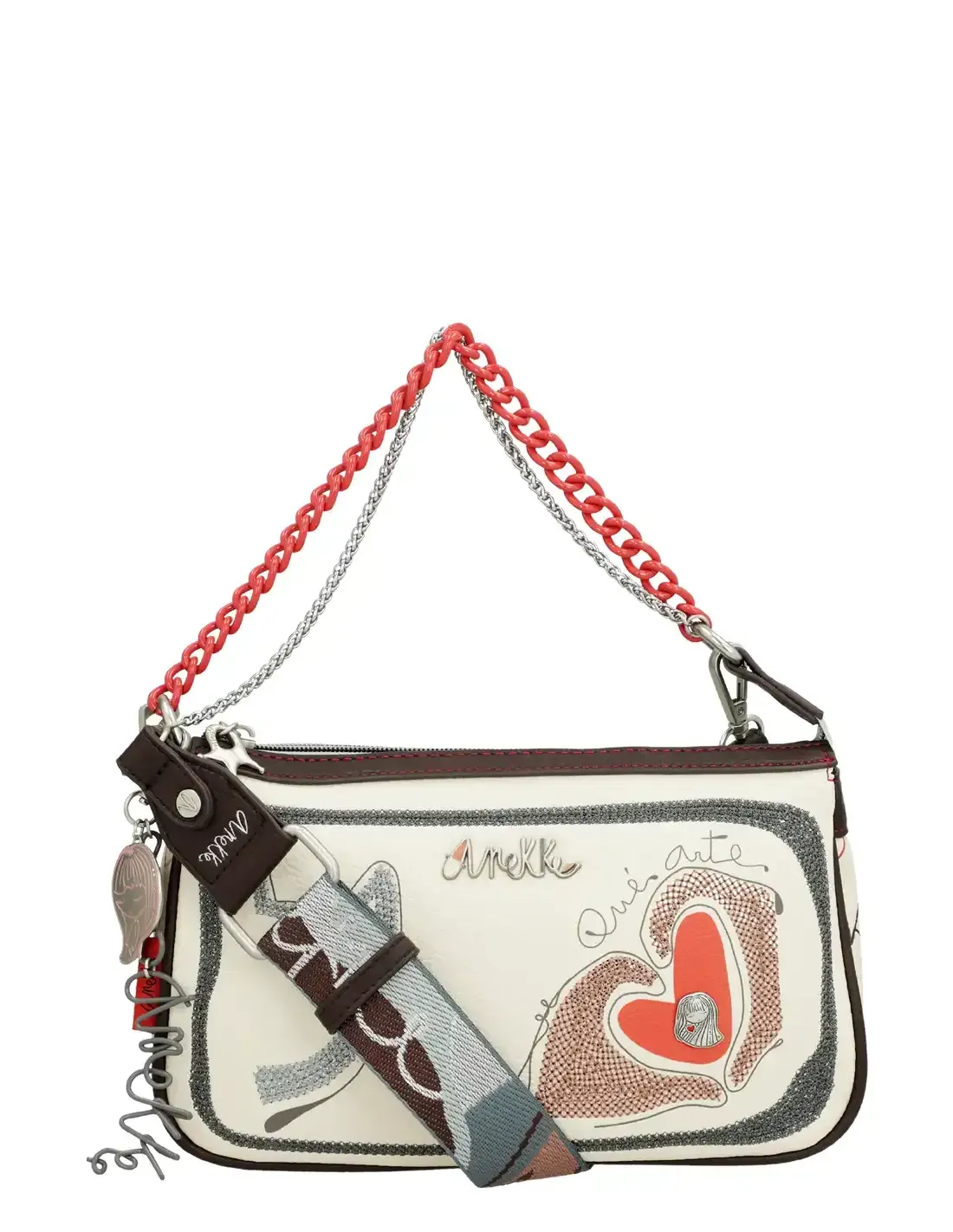 - Doble asa per multiplicar estils. La bossa inclou una asa metàl·lica d'eslabons per a un look sofisticat i una asa de cotó extraïble i regulable, ideal per lluir com a bandolera i adaptar-te a tu en tot moment.