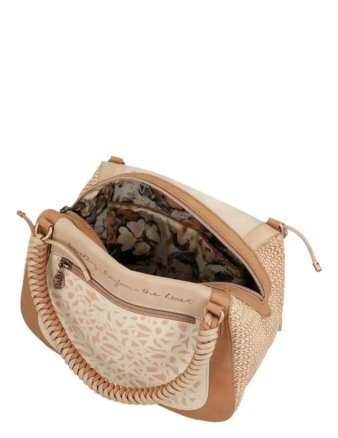 - Comoditat I Adaptabilitat. Gràcies a les seves dobles anses trenades i corretja bandolera regulable, pots portar-lo com més t'agradi, brindant-te la llibertat de moviment que necessites.
