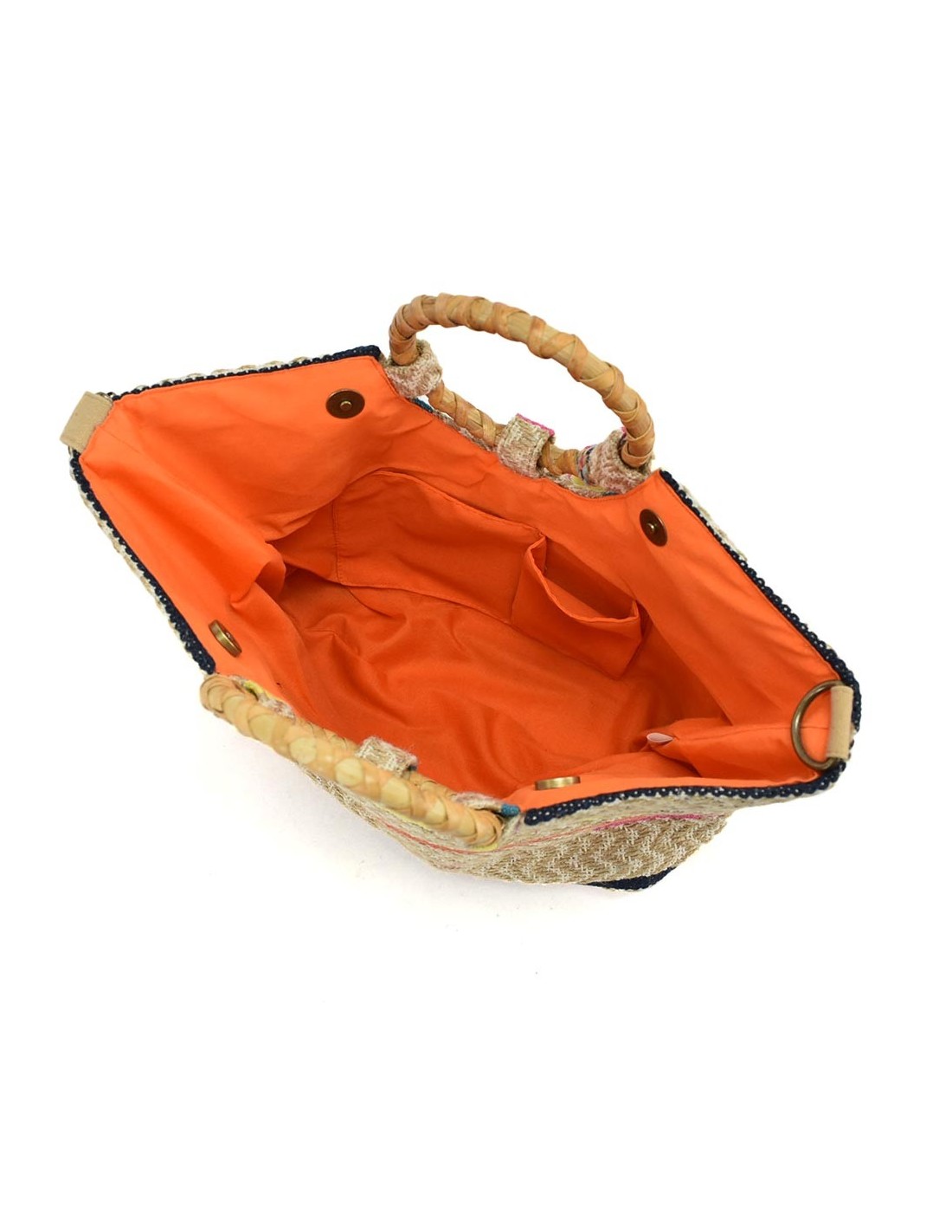 - el seu interior va folrat amb teixit de cotó en color taronja i es tanca mitjançant dos botons imantats. Disposa de butxaca amb tancament de cremallera i dues butxaques extres oberts, ideal per a tenir a mà les teves coses.