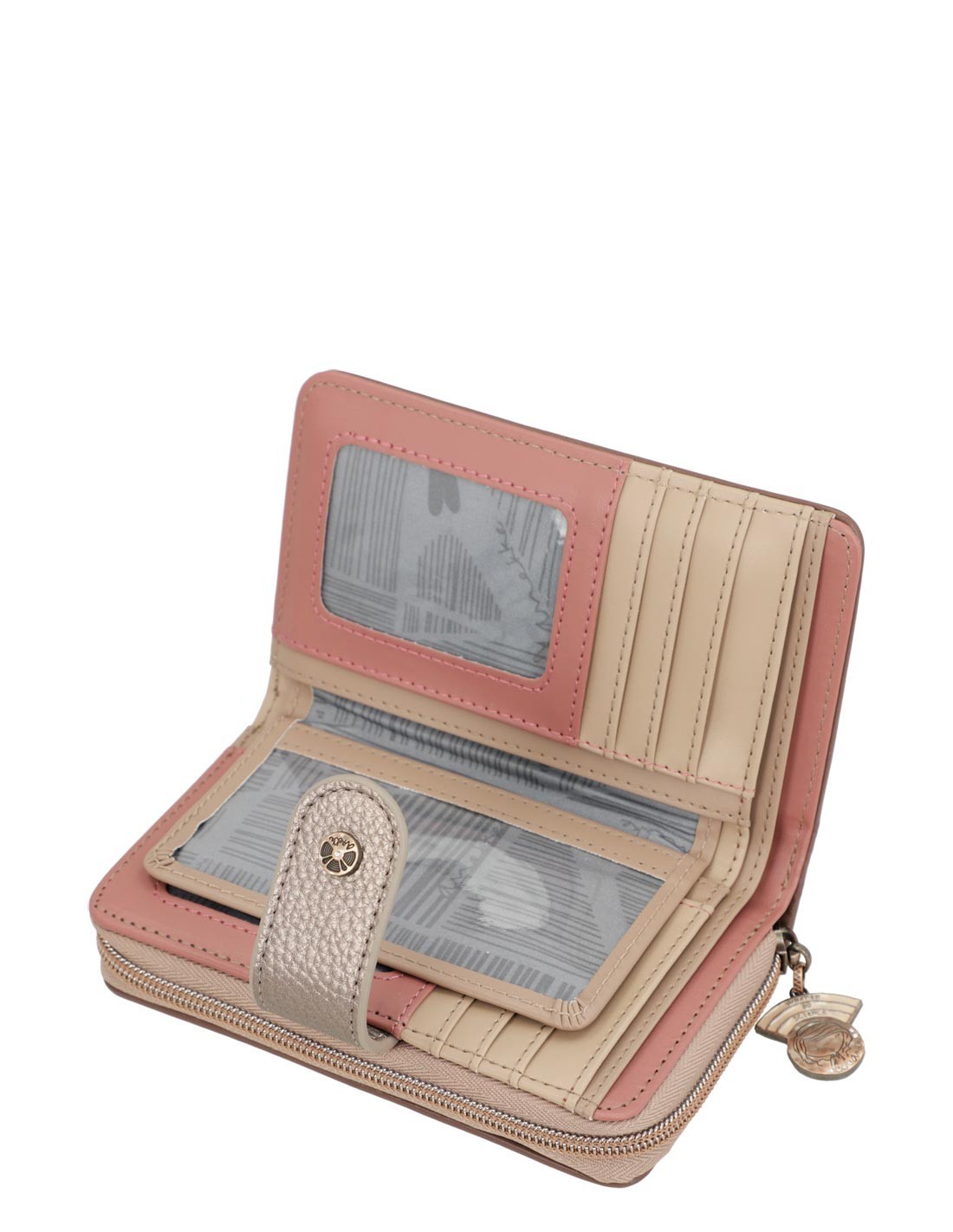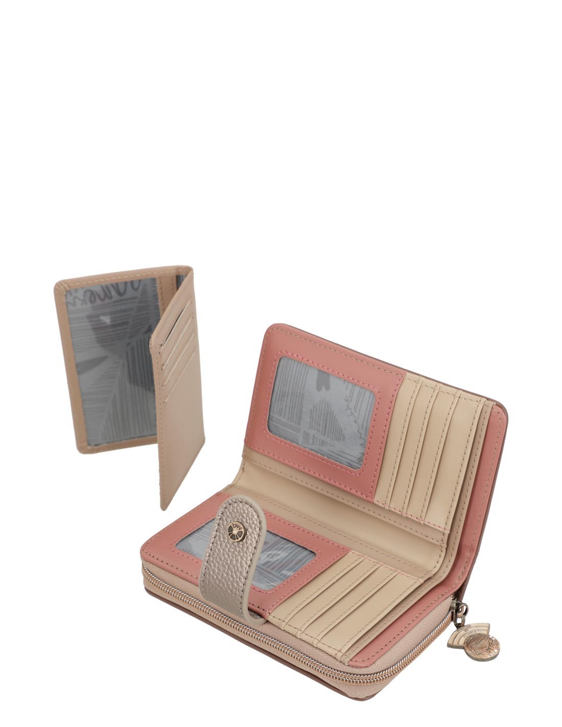 - La part superior amb tancament de cremallera i un original tirador personalitzat, amaga a l'interior diferents compartiments per a les monedes.