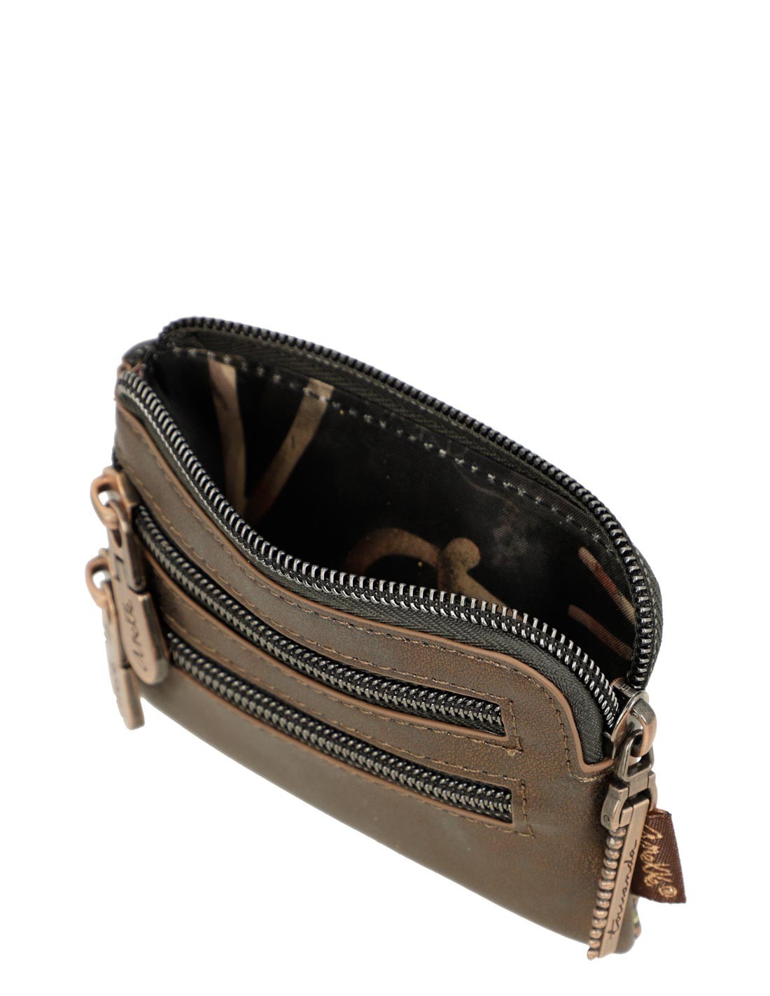 - Elegància a Cada Detall Aquest moneder de la col·lecció Wings d'Anekke destaca per la seva combinació harmoniosa de marró i beix. L'elegància dels seus colors es complementa amb les ales fossilitzades en el disseny frontal, adornades amb delicats punts daurats i metal·litzats que capturen la llum de manera sublim.