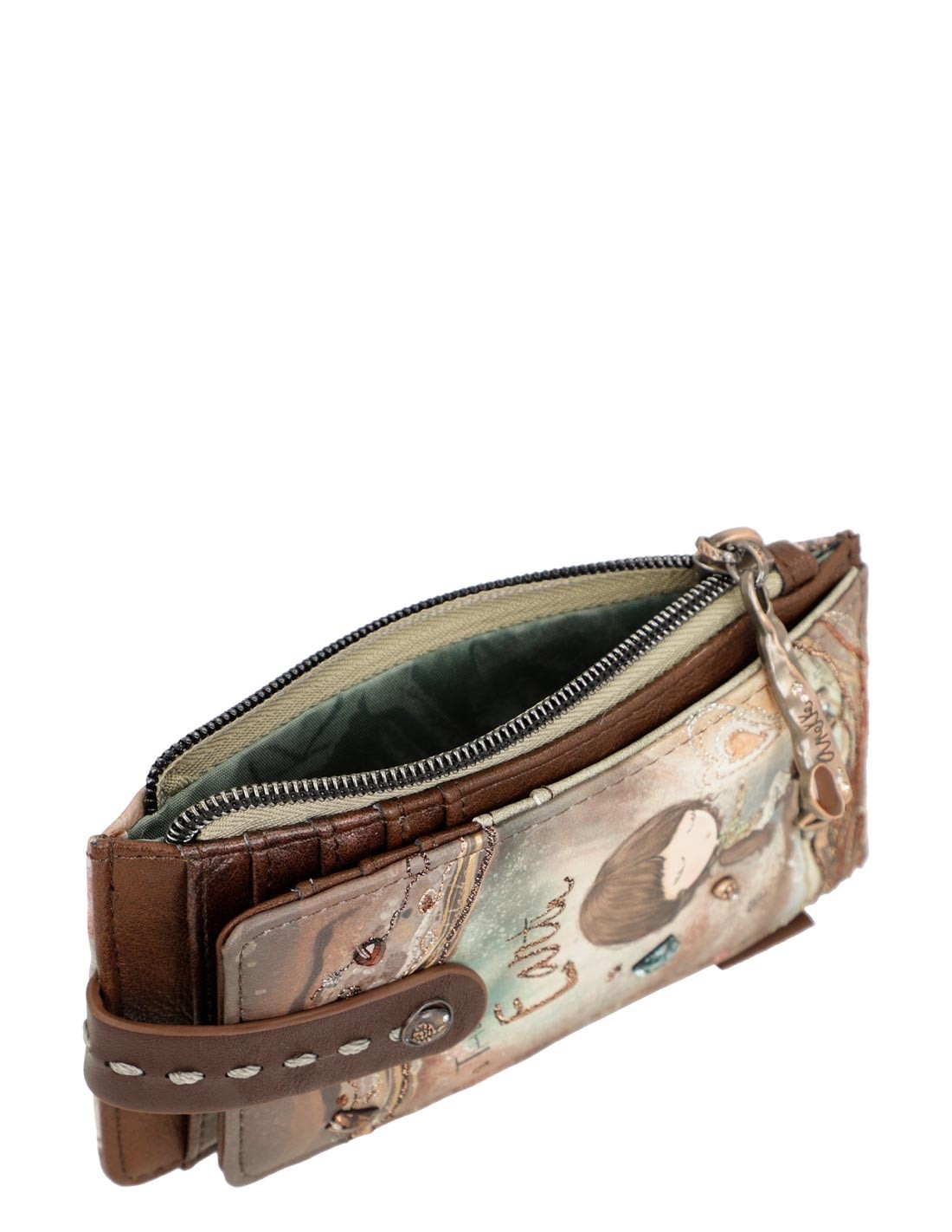 - Aquest original moneder compta amb dos compartiments amb protecció RFID: un de frontal, que s'obre mitjançant llengüeta amb botó de pressió, l'interior del qual allotja espai per a 10 targetes i un de superior amb cremallera per a monedes.