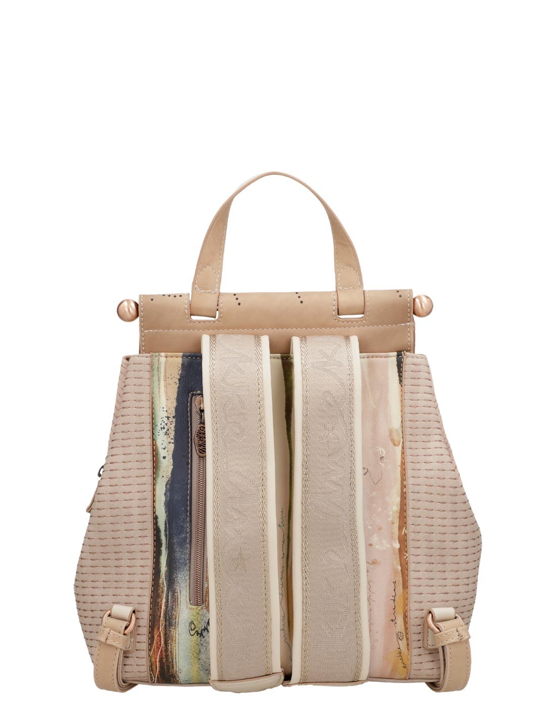 - Aquesta original motxilla de mida gran porta una bonica combinació de colors nude, amb la part posterior de colors, un estampat inspirat en les ones que genera el wifi.