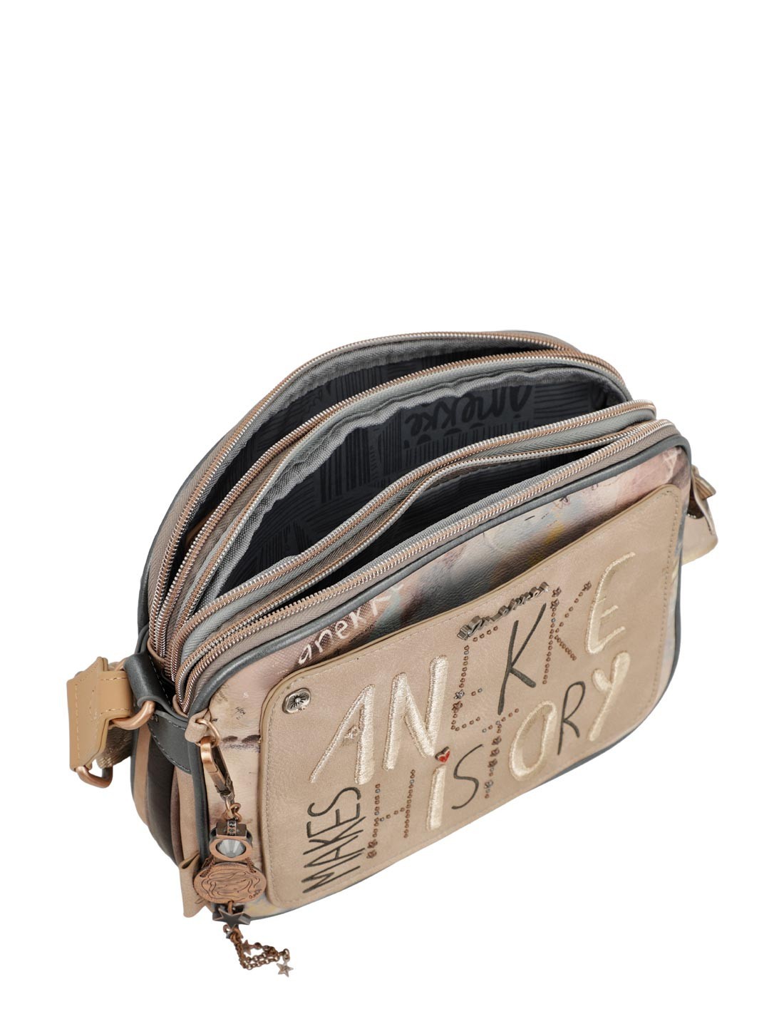 Esta bandolera triple compartimento de la serie Stars de Anekke es el accesorio perfecto para aquellas que buscan un toque de glamour en su día a día. Con un diseño en color beige y gris que combina estampados, lettering, bordados y detalles iridiscentes, esta colección te transporta a las luces de Hollywood, donde cada foco brilla por ti.