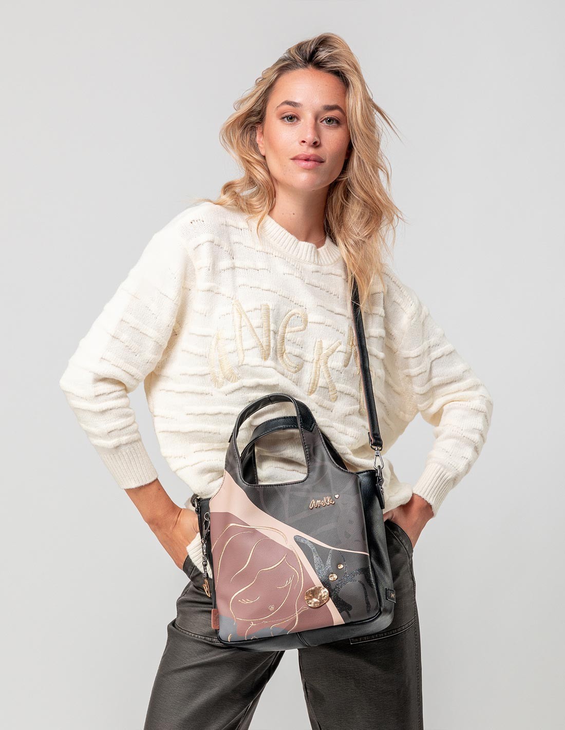 - Su original diseño combina diferentes elementos estampados, sobre los que se superpone la silueta de Anekke bordada con hilo metalizado. Esta colección se caracteriza por su tacto blando y agradable.