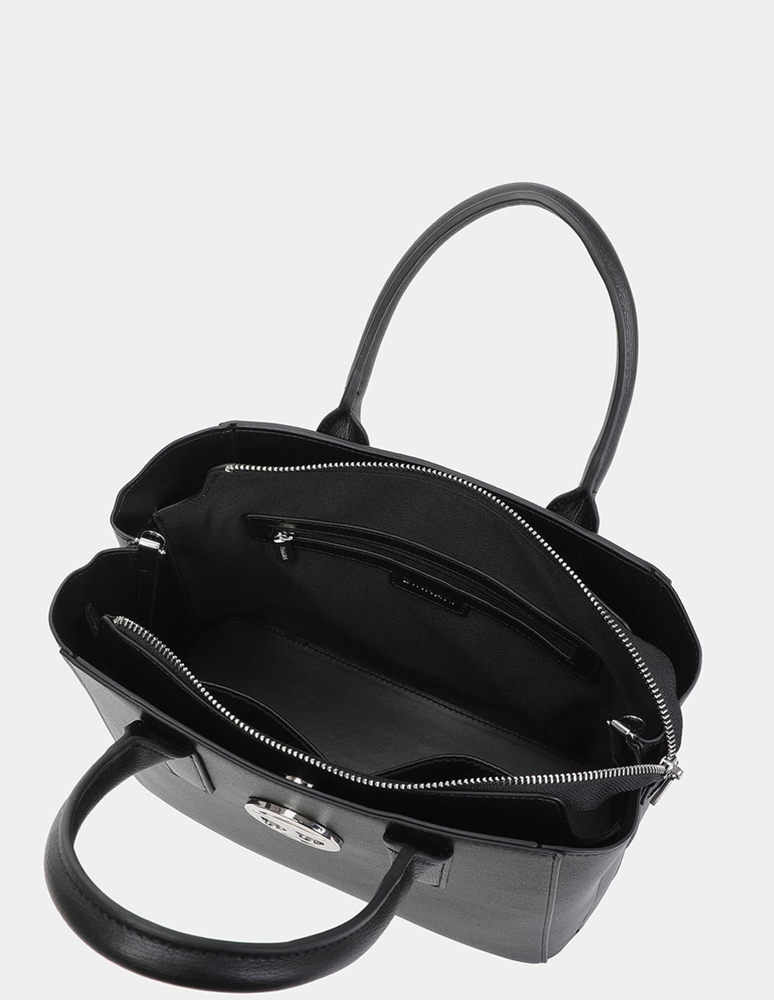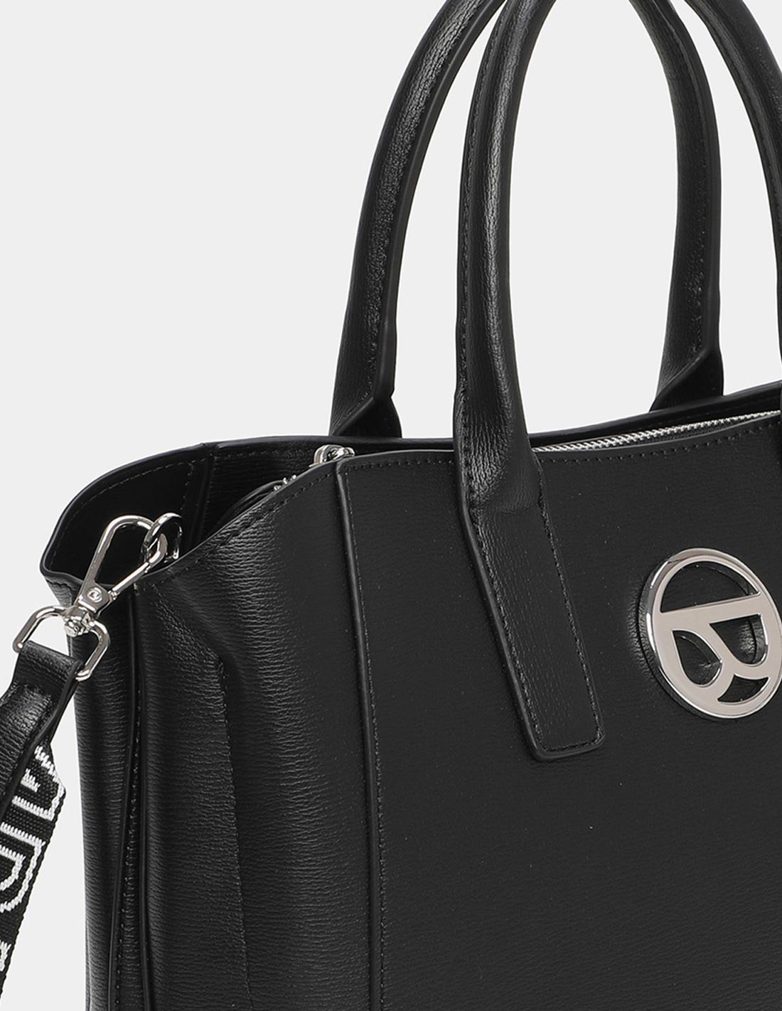 - Estilo único con el logo de la marca en color plata a juego con todos sus detalles. Las asas de mano y la cinta bandolera ancha de algodón negro con la silueta del nombre de la marca en blanco completan el look.