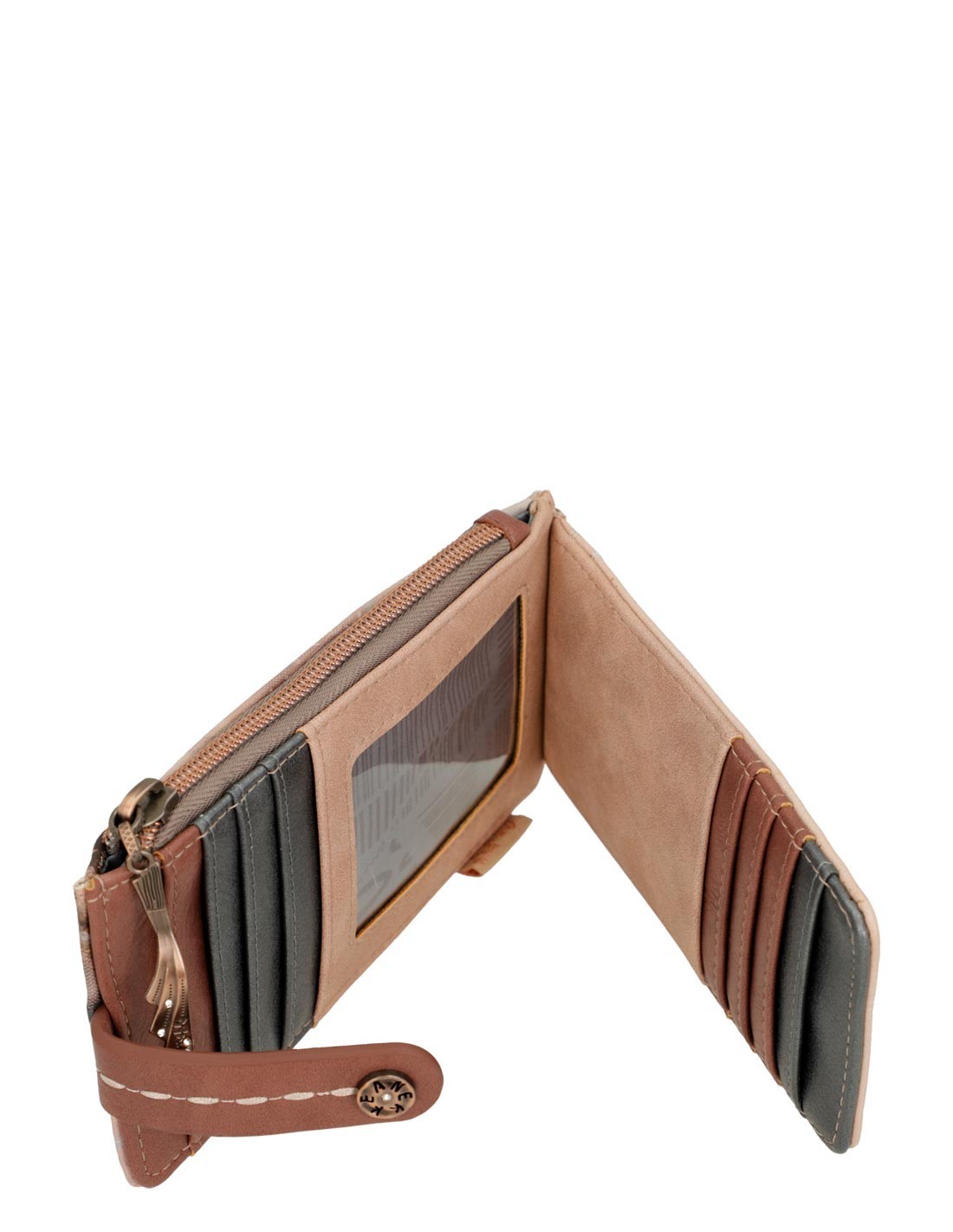 - Este original monedero cuenta con dos compartimentos con protección RFID: uno frontal, que se abre mediante lengüeta con botón a presión, cuyo interior alberga espacio para 10 tarjetas y uno superior con cremallera para monedas.