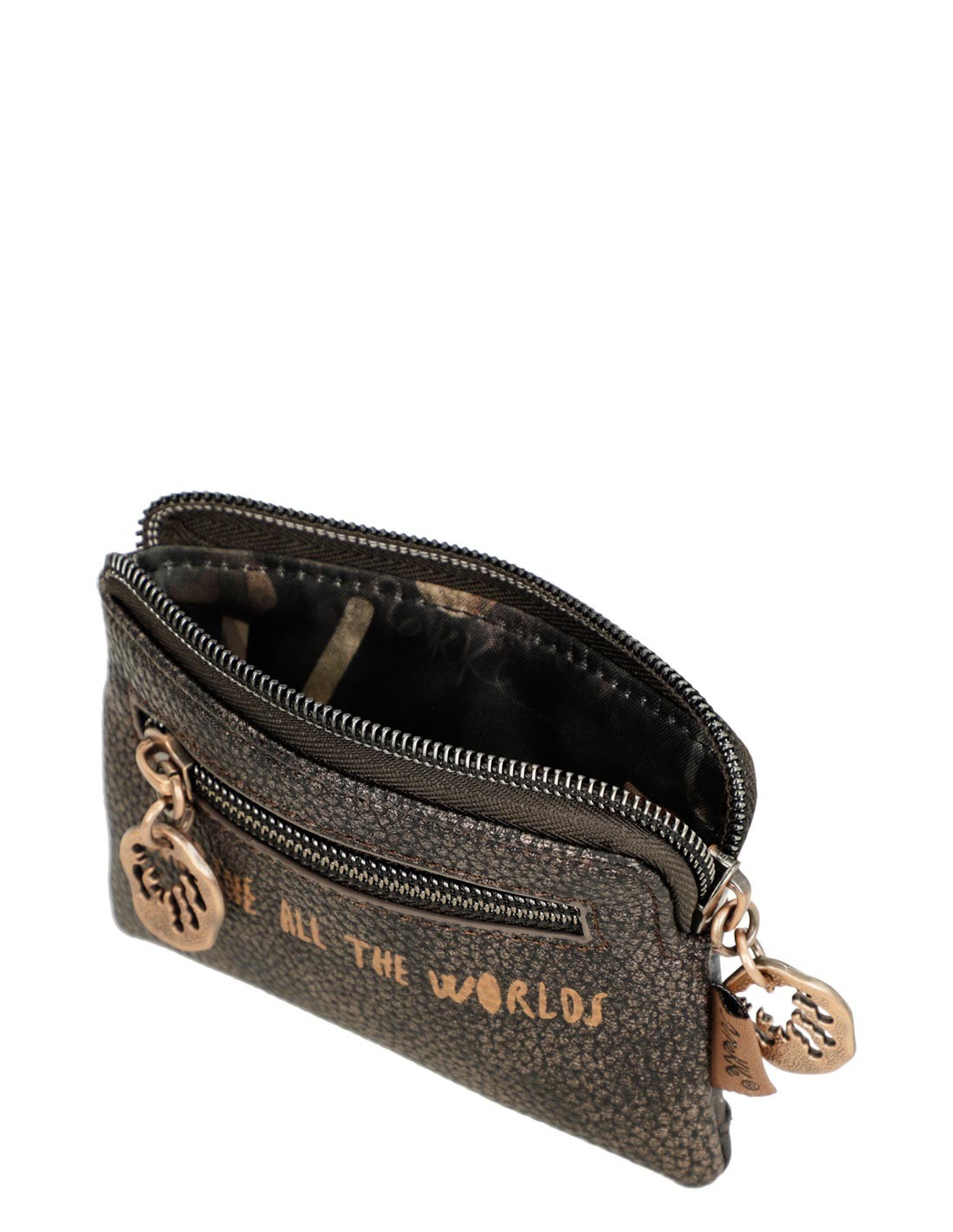 - Cuenta con dos compartimentos: uno frontal que se abre mediante lengüeta, cuyo interior alberga espacio para tarjetas y DNI, y uno superior con cremallera para monedas.