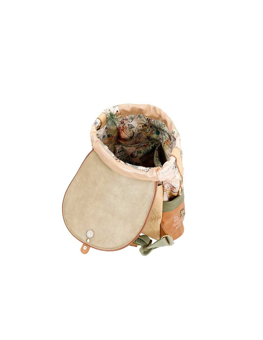 - en la parte frontal encontrás un amplio bolsillo estampado con cierre de cremallera y un bonito tirador con la forma del mono araña. También cuenta con bolsillos en ambos laterales, ideal para la botellita de agua o incluso el paraguas en los días de lluvia. El departamento principal se abre mediante una solapa con botón a presión, en su interior hay bolsillos organizadores y cremallera para tener a mano lo que mas necesites;