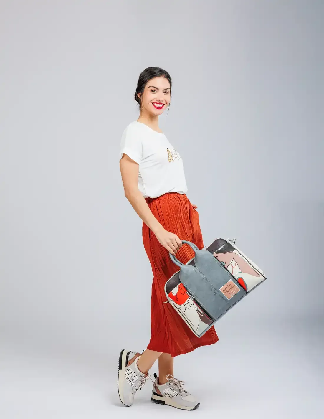 - Diseño Inspirado y Único. El estampado repleto de detalles artísticos, bordados, pins y tiradores personalizados te conecta con la alegría y la energía de España, celebrando la cultura y el arte con referencias a Miró y frases inspiradas en la música.