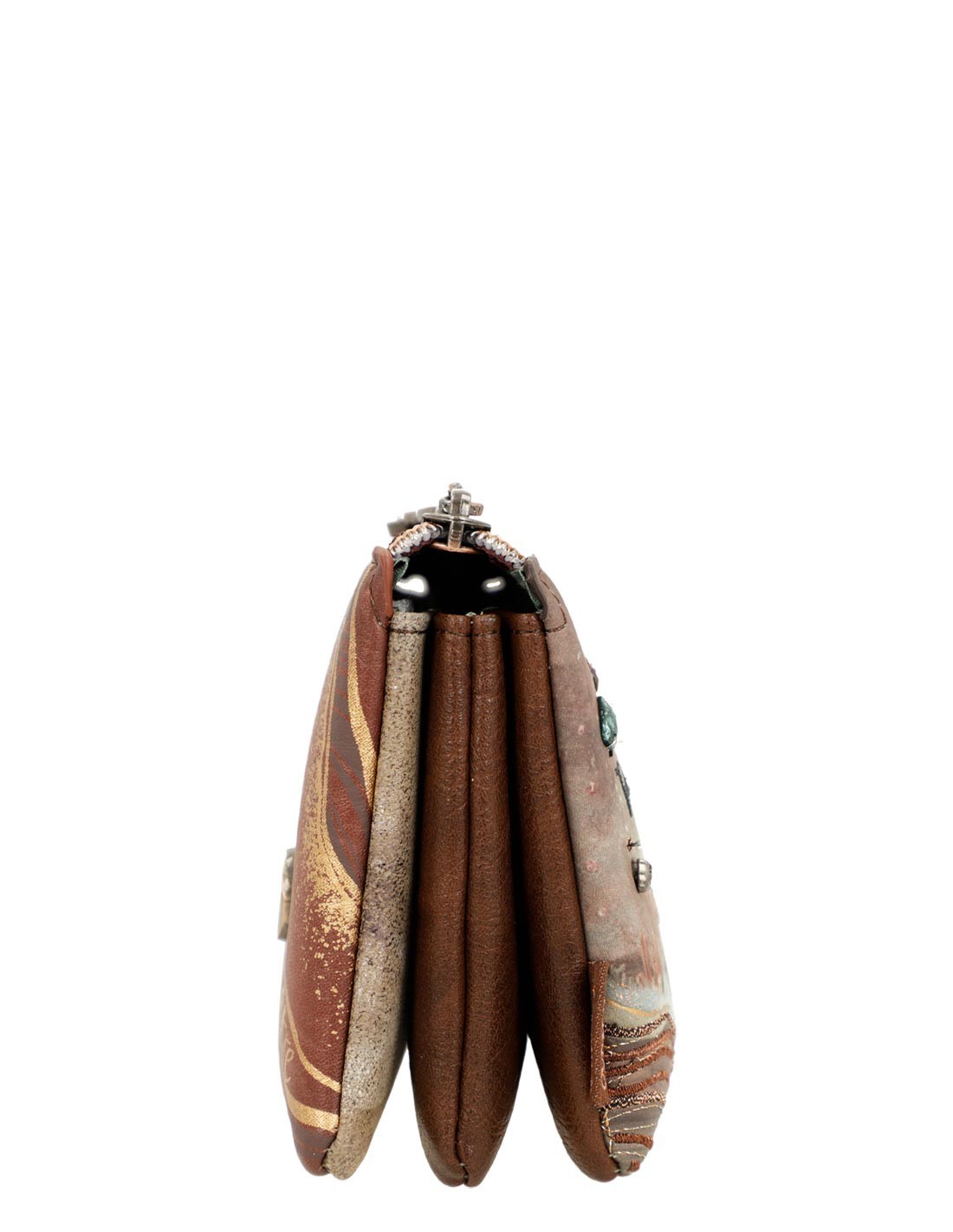 - Este bonito porta-moedas traz uma bonita combinação em tons castanhos, com toques em bege, verde e laranja. Repleto de texturas, cores e formas geológicas onde fósseis, minerais e rochas se vão convertendo em estampados e elementos decorativos.