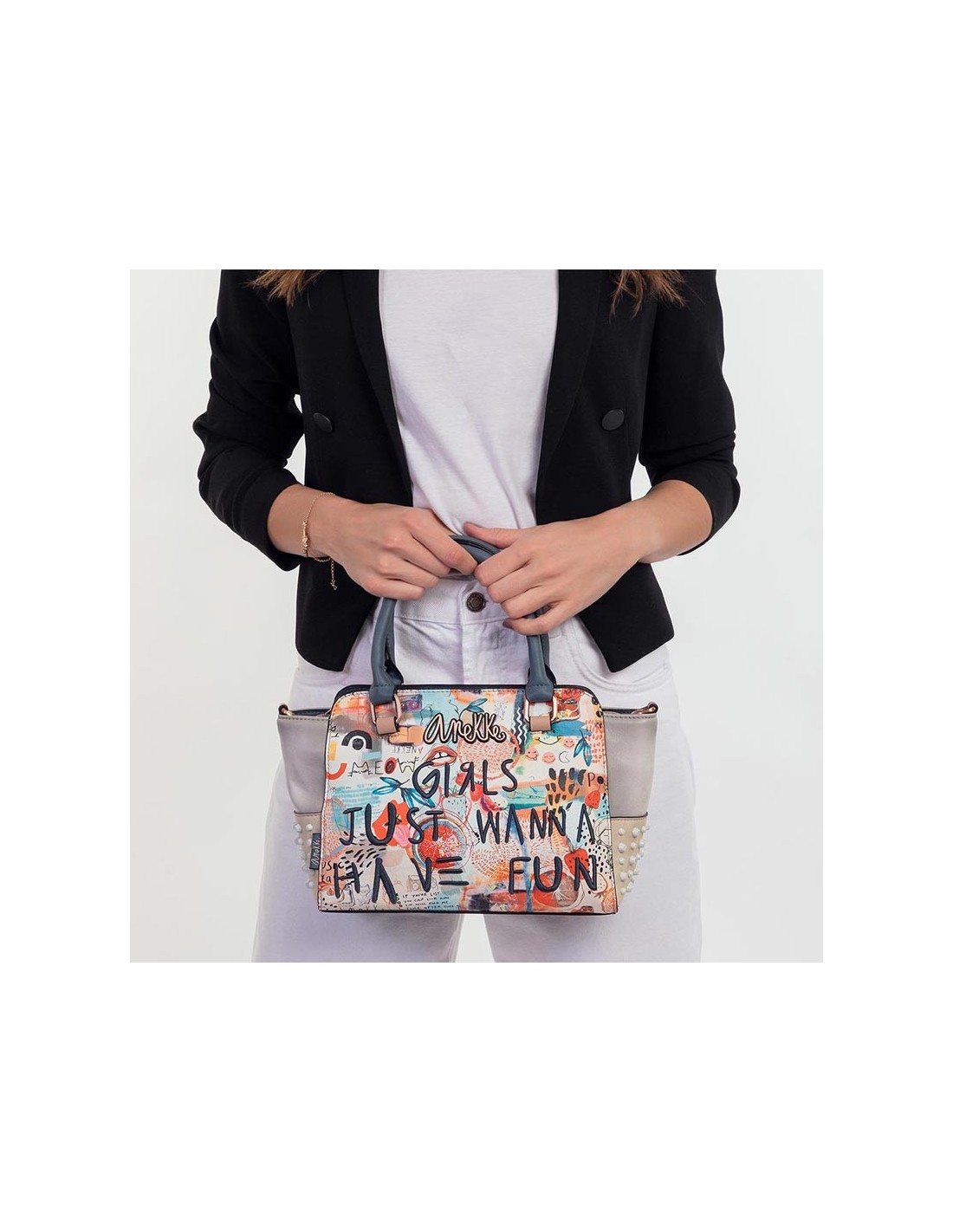 - tem uma bela estampa na frente, bordada com o relevo de uma das canções mais populares de Cindy Lauper "Girls just wanna have fun", combinando os lados beges cobertos com tachas brancas;