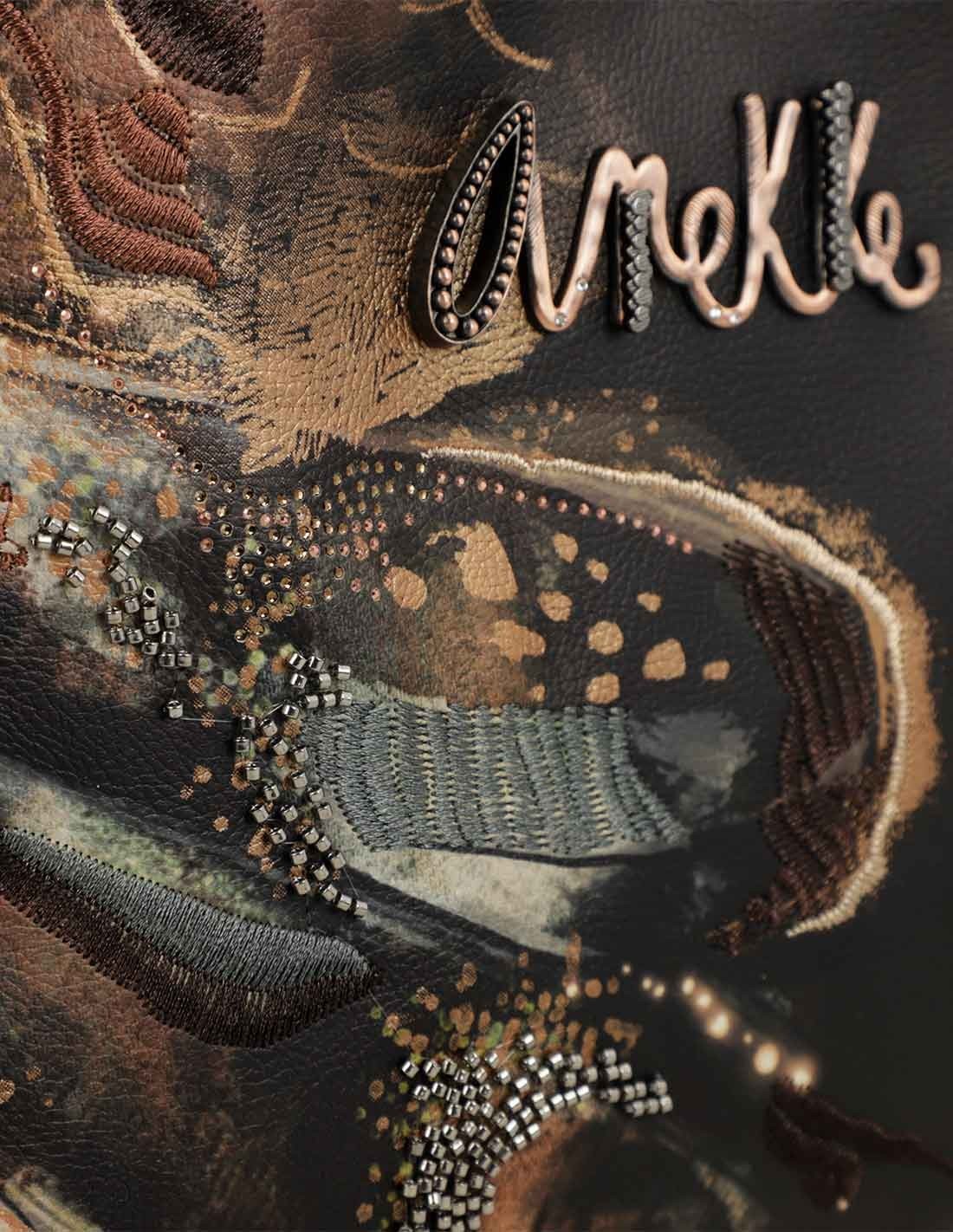 - Esta coleção caracteriza-se pela elegância do seu design em castanho escuro e bege. Nele descobrirás as formas de umas asas fossilizadas na parte frontal, com detalhes únicos, como pontos dourados e metalizados.