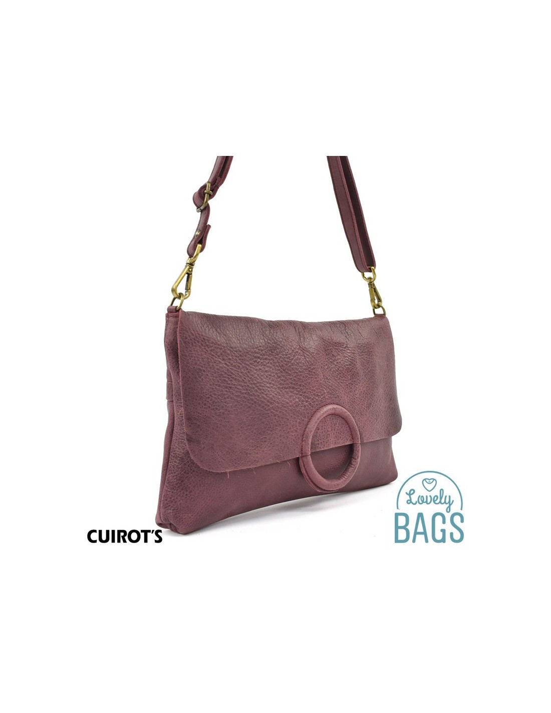 a parte da frente é fechada com uma aba decorada com um anel forrado com o mesmo couro;