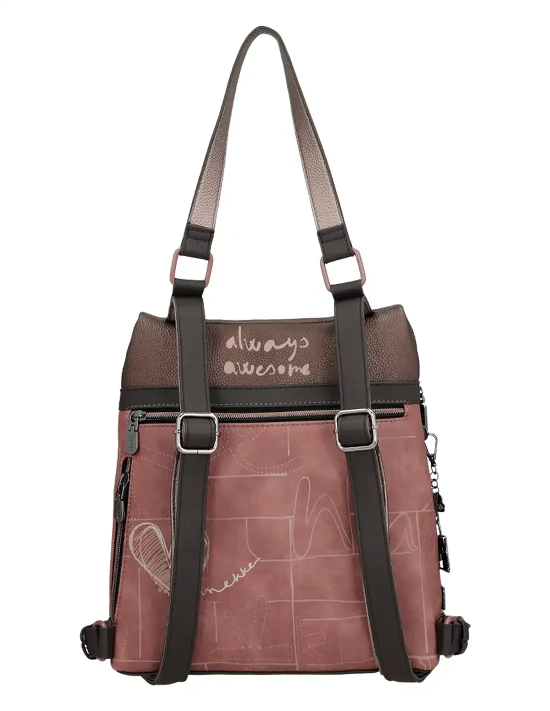 - Estilo que conquista. Cor castanho escuro com estampado frontal em granada, preta e bege com toque metalizado; parte de trás num delicado tom rosado.