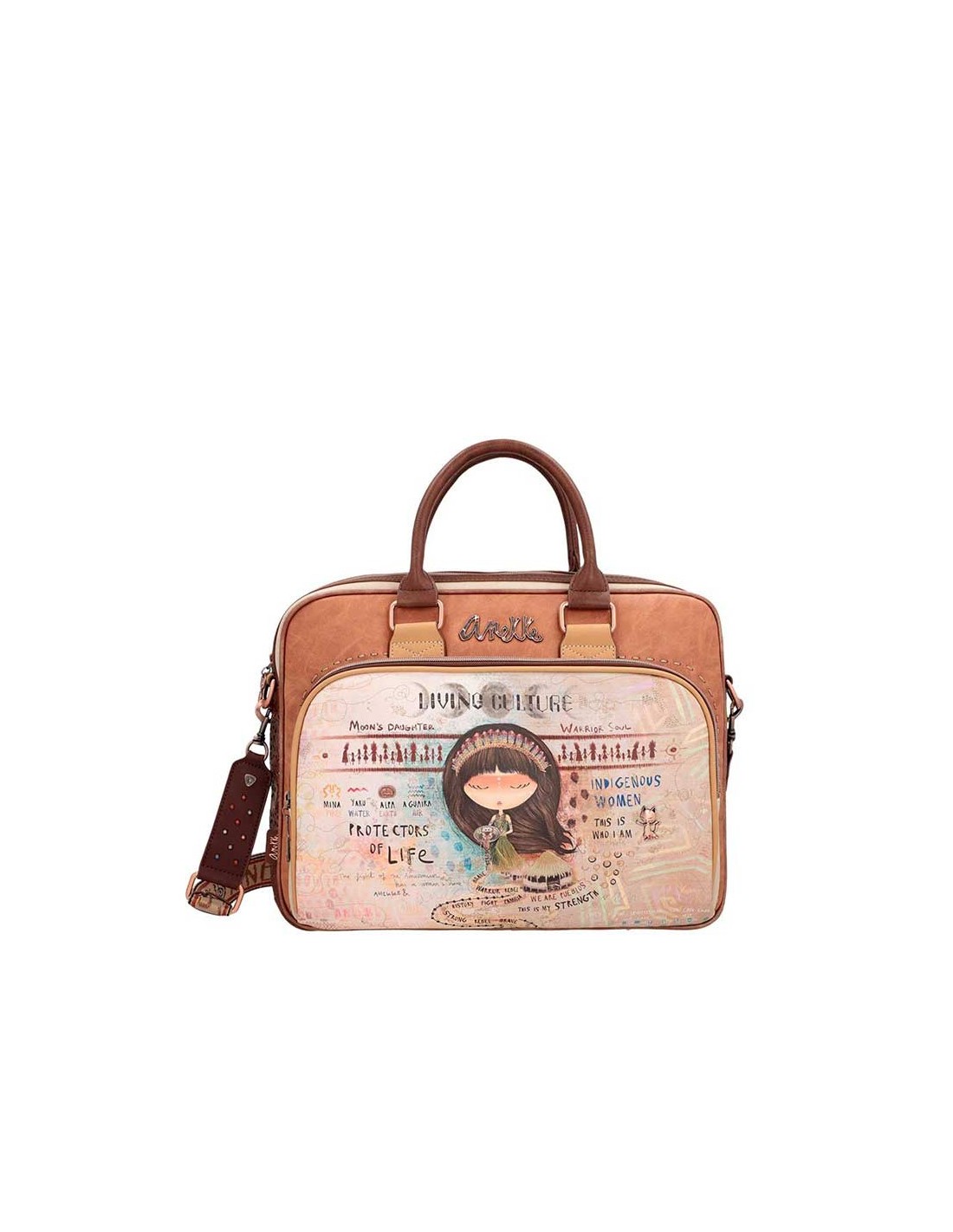 - Design Inspirador: Esta mala combina diferentes estampados inspirados no coletivo de mulheres indígenas da Amazônia. A parte frontal apresenta Anekke caracterizada como uma filha da lua, com detalhes requintados como bordados, pin e apliques.