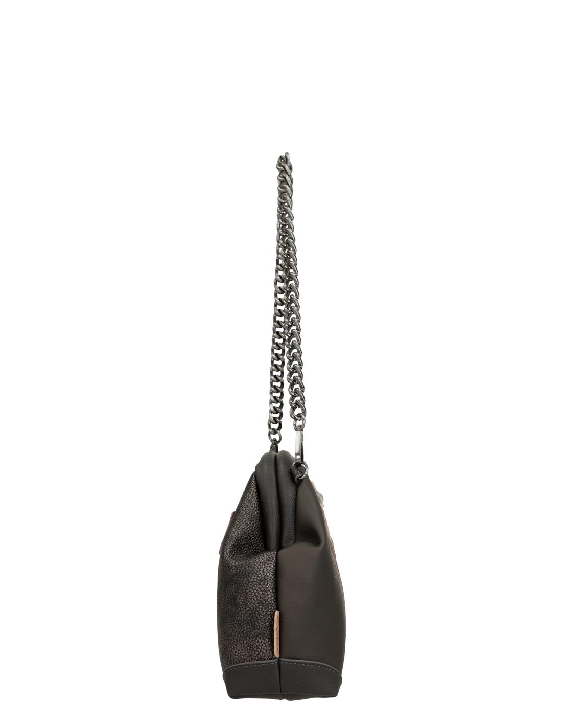 - Possui uma alça a tiracolo removível e ajustável em comprimentos diferentes, além de uma alça metálica de elos.
