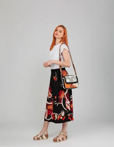 - Design Enraizado na Cultura e Beleza Espanhola. Estampado de círculos inspirado nos típicos lunares, recriando artesanalmente uma rede de vime cheia de cor e vida, evocando a essência de Espanha.